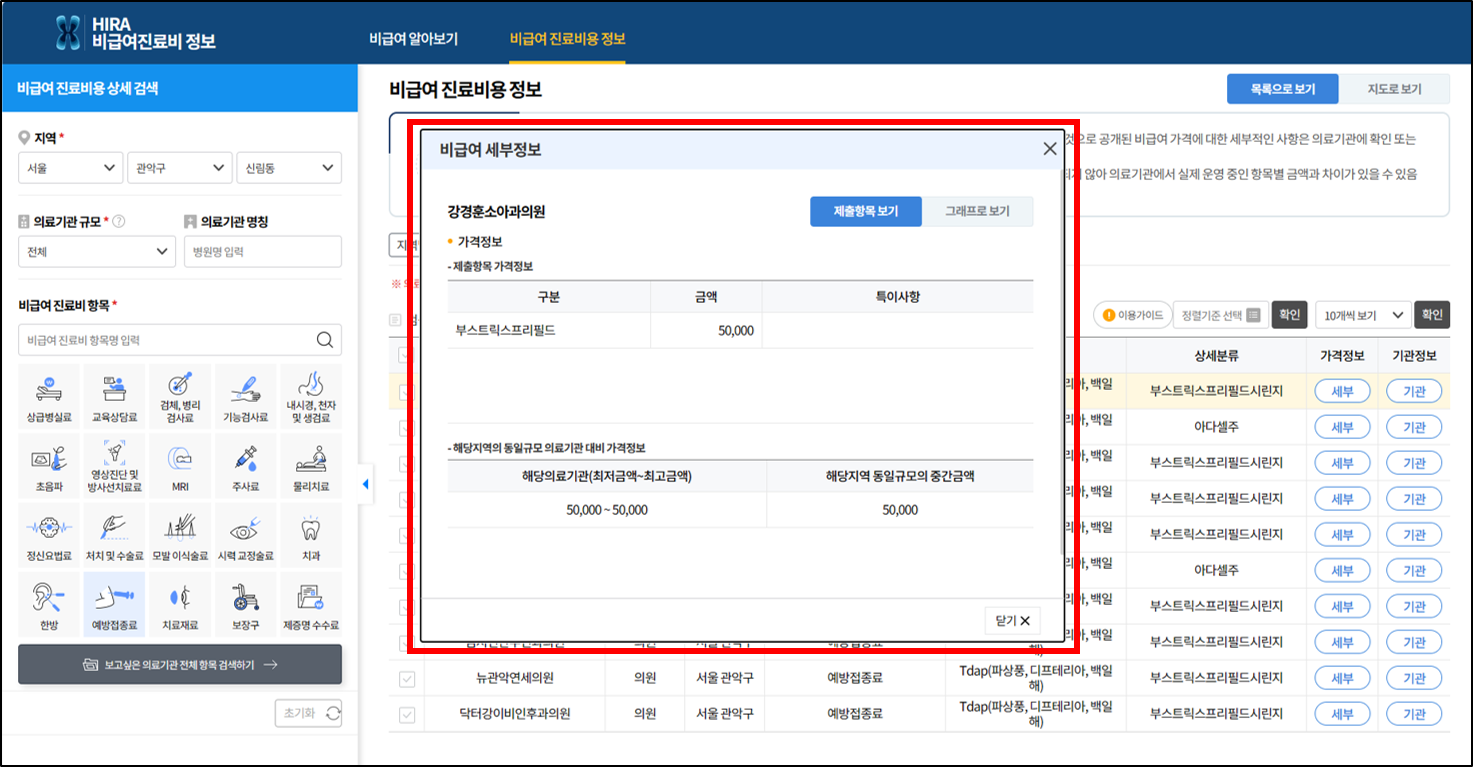 비급여 진료비용 정보를 통해 지역 시도 선택하고 시군구, 읍면동을 선택해서 조회합니다. 의료기관규모에 따라 예방접종료가 상이할 수 있으니 미리 확인해 보시고 방문하시기 바랍니다.