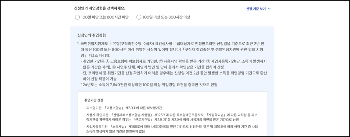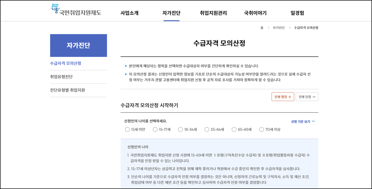 수급자격 모의산정을 하는 과정은 질문들에 대하여 본인에게 해당되는 항목을 선택하면 수급대상자 여부를 확인하실 수 있습니다.