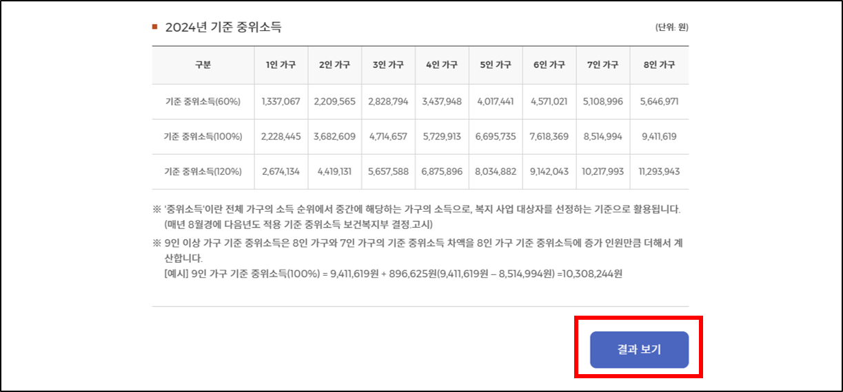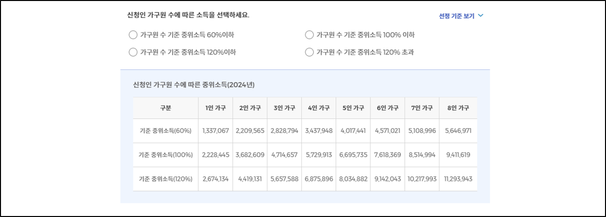 8. 신청인 가구원 수에 따른 소득을 선택하세요.