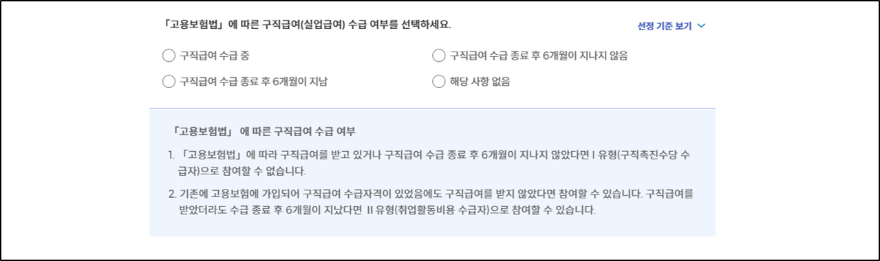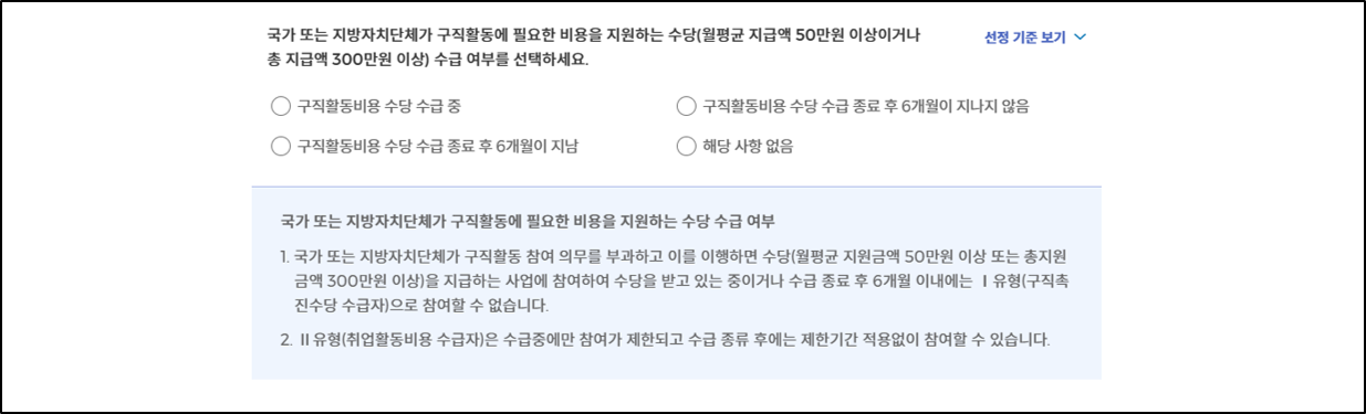 - 국가 또는 지자체의 구직활동 지원 수당 수급 여부 선택