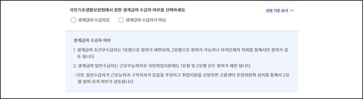 - 국민기초생활보장법에서 정한 생계급여 수급자 여부 선택