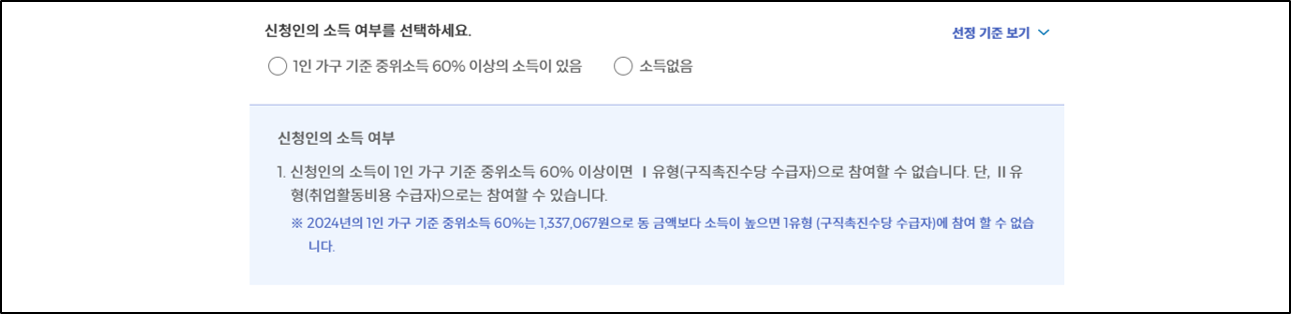 단, 신청인이 수급 제외 대상이거나 재참여 제한기간에 속해 있으면 참여할 수 없으니 해당 내용을 먼저 확인한 후 신청하시기 바랍니다.
