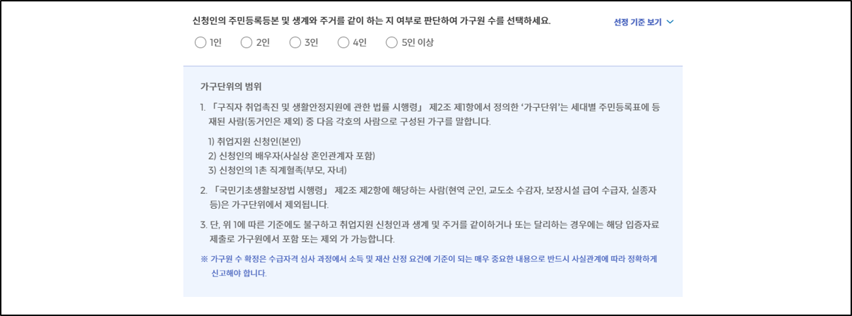 7. 신청인의 주민등록 및 생계와 주거를 같이 하는 지 여부로 판단하여 가구원 수를 선택하세요.