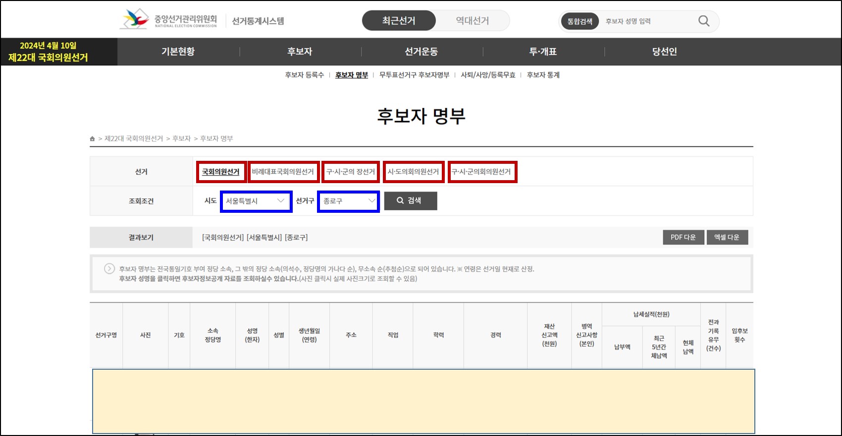 중앙선거관리위원회 누리집으로 들어가서 후보자 명부 조회를 하면 이번에 누가 출마 했는지 알 수 있을 뿐만 아니라 경력 및 재산 등에 대한 정보까지 알 수 있습니다.