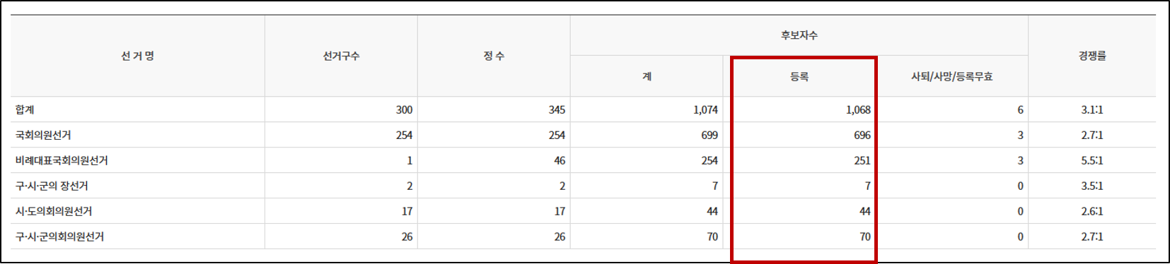 이번 선거의 총 등록자는 1,068명으로 국회의원 후보자만 696명으로 평균 2.7대 1의 경쟁률을 보이고 있습니다.