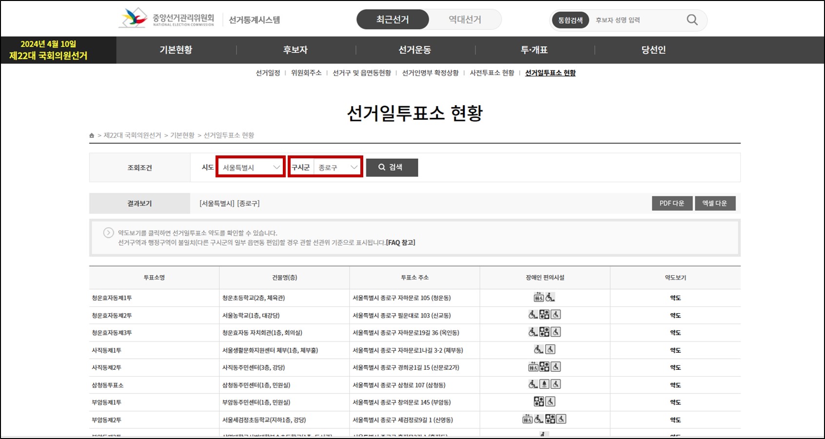 중앙선거관리위원회 누리집으로 들어가 시, 도를 선택한 후 거주 지역 읍면동까지 선택하면 투표소 정보를 확인할 수 있습니다.